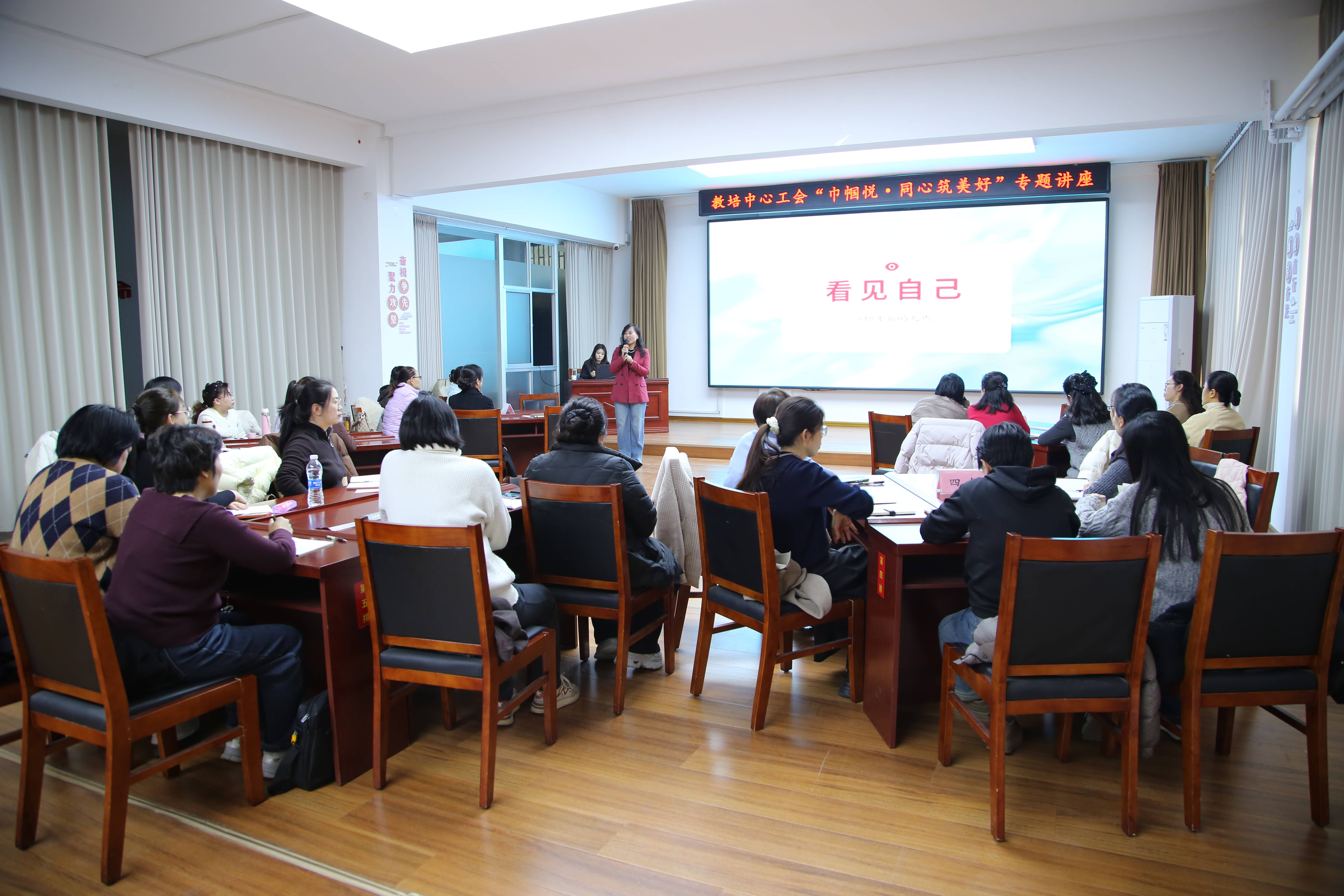 精准对接女职工个人价值实现和心理健康需求,教培中心工会开展“巾帼悦・同心筑美好”专题讲座,特邀专业心理学老师倾情授课、精准赋能。讲座以《职场绽芳华 家庭享温情》为主题,紧扣女职工普遍关心的职场压力疏解、日常情绪调节、家庭关系经营、自我价值实现等热点话题,用专业、温暖、实用的心理学知识,结合互动答疑、冥想放松、情景引导、案例分析等多种形式,为女职工带来一场滋养心灵、赋能成长的精神盛宴。整场讲座节奏轻快、内涵丰富,现场氛围热烈融洽,女职工们认真聆听、积极互动,在轻松愉悦的氛围中学会观照内心、接纳自我、释放压力、调节情绪。大家纷纷表示,此次讲座既学到了实用的心理调适方法,也深切感受到了工会组织“娘家人”的关怀与温暖,今后将以更加积极平和、乐观向上的心态面对工作与生活,立足岗位、奋勇争先,以巾帼之姿绽放芳华、贡献力量。